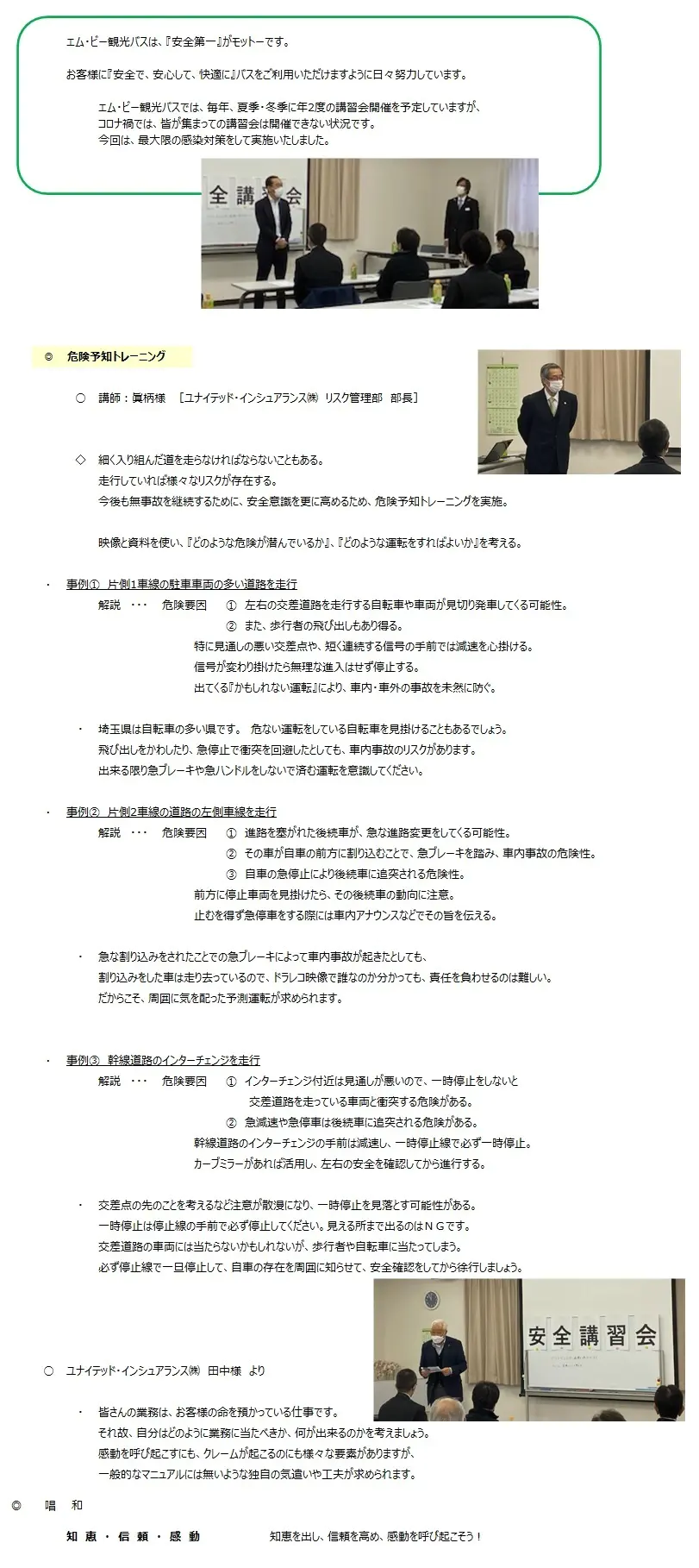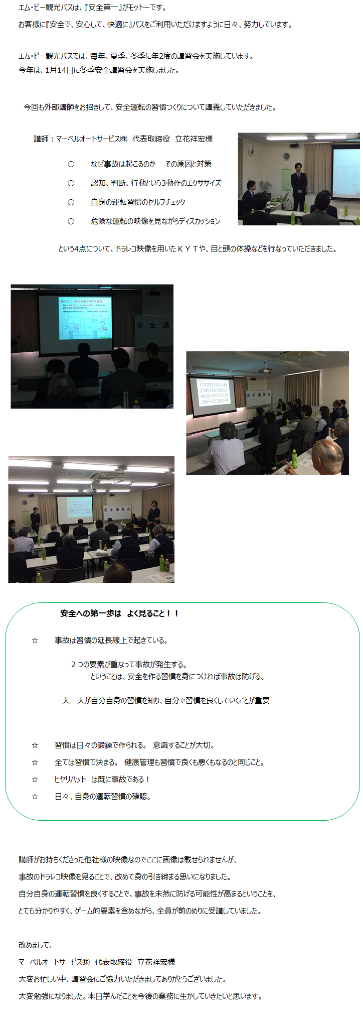 運輸安全マネジメント 2025年度運輸安全マネジメントの取り組みに関して掲載いたしました。全社員が一丸となって安全輸送に取り組んでいきます。 運輸安全マネジメント エム・ビー (2025年度) 冬季安全講習会(2022.01.10) 夏季安全講習会(2019.8.12) 冬季安全講習会(2019.01.14) 安全装備 お薬について